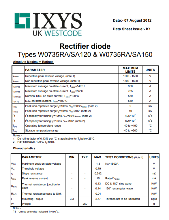 이번에 소개 드릴 제품은 IXYS UK WESTCODE사의 W0735SA120 입니다.